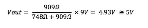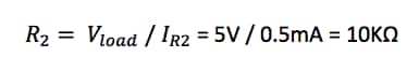 Let’s talk a moment about how to decide the resistor values you will need for your voltage divider.  To do so, you must take into account the load that will be connected to the output of the voltage divider.  Let’s assume our load is 1KΩ and requires 5V at 5mA.  We now apply the “10% Rule” so that the “bleeder current” through R2 is 10% of the current that we want to follow though the load.  In this case: